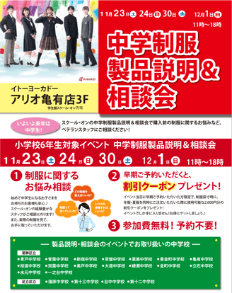 イトーヨーカドーアリオ亀有店3Fにて、以下の日程で、中学制服の製品説明会&相談会を開催いたします。